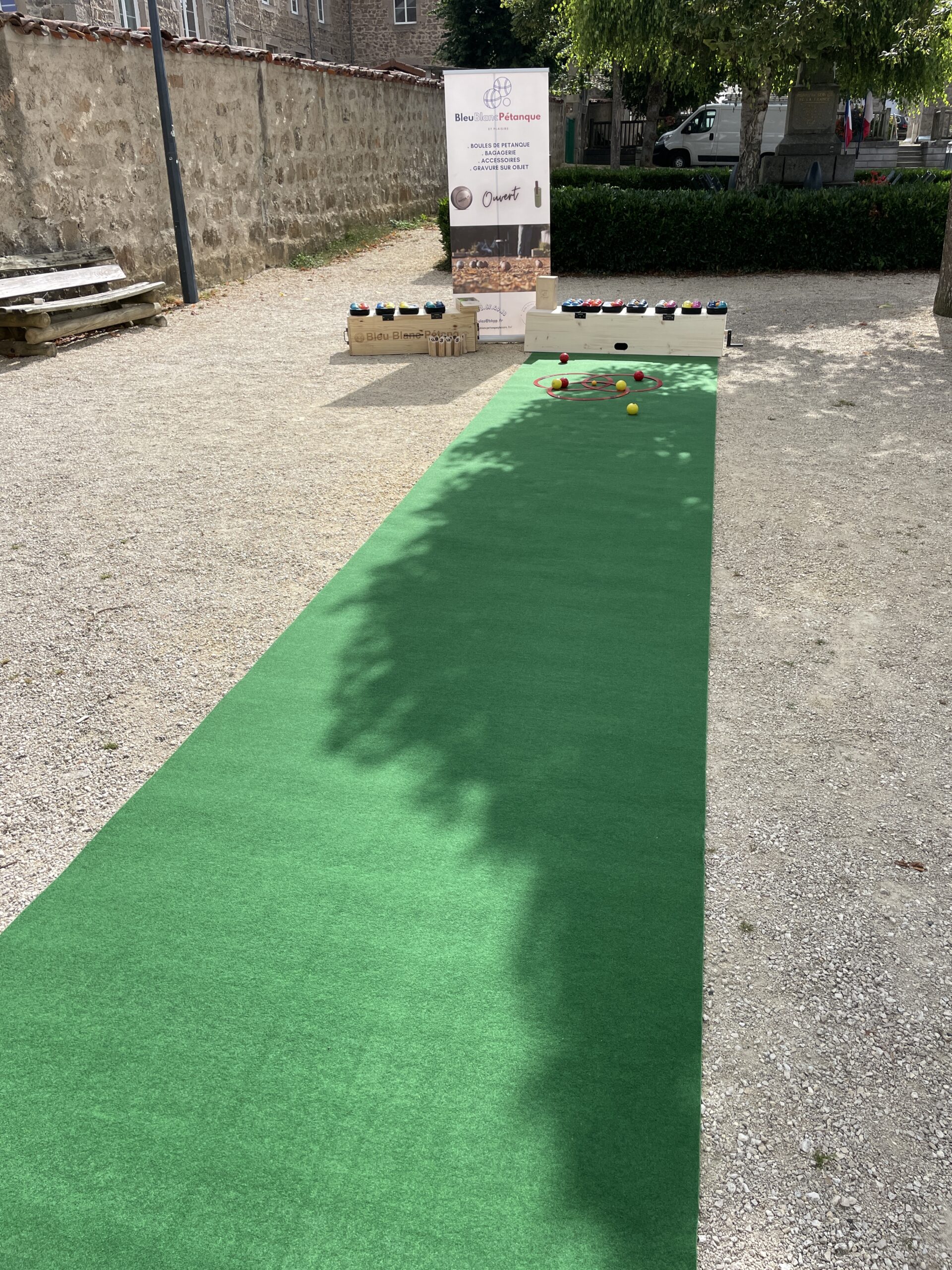 Découvrez notre coffret transportable pour jouer chez vous ou proposer des animations dans votre établissement en déroulant facilement votre terrain de pétanque intérieur pour jeux de pétanque avec nos boules de pétanque PVC.